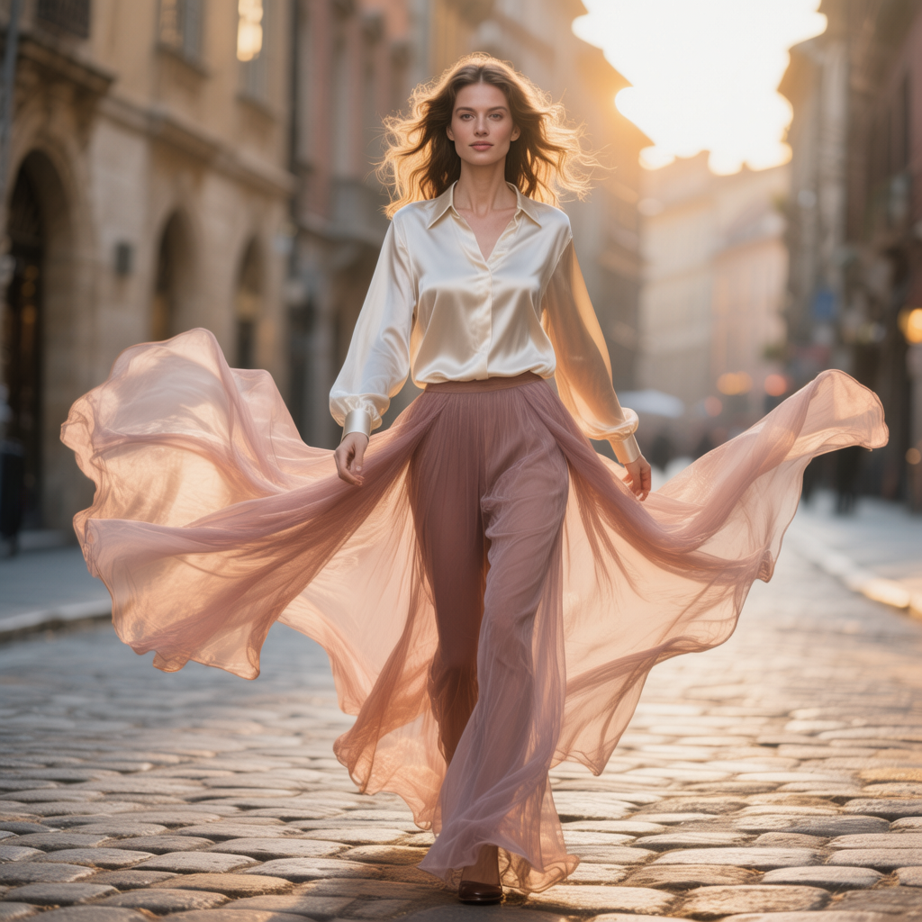 The season’s favorite cuts are fluid and soft: satin slip dresses, chiffon trousers, silk blouses. Spring outfits 2026 move when you move.
